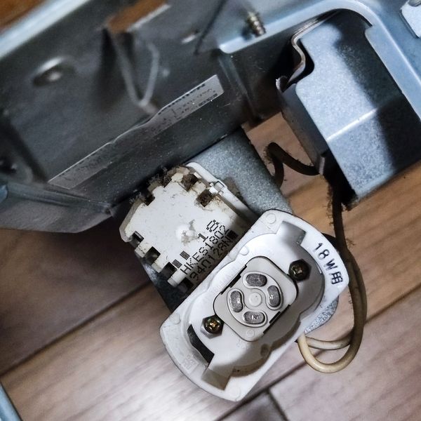 蛍光管の口金付近の写真です。蛍光管は「FDL18EX-N」を使用していました。口金の上に見える部分が電子スターターのようです。グローランプが見つからないわけですね。