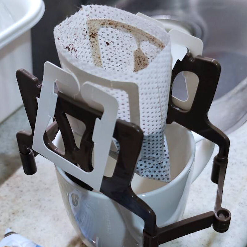 現時点で利用しているドリップバッグ(ドリップパック)は、カップの上に大きくせり出していて、コーヒーに浸りにくい構造になっています。