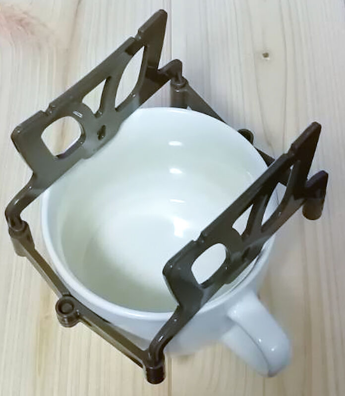 コーヒカップにセットすると上のようになります。ここにドリップバッグをセットするとカップの上に大きくせり出すことになり、コーヒーに浸ることはなさそうです。