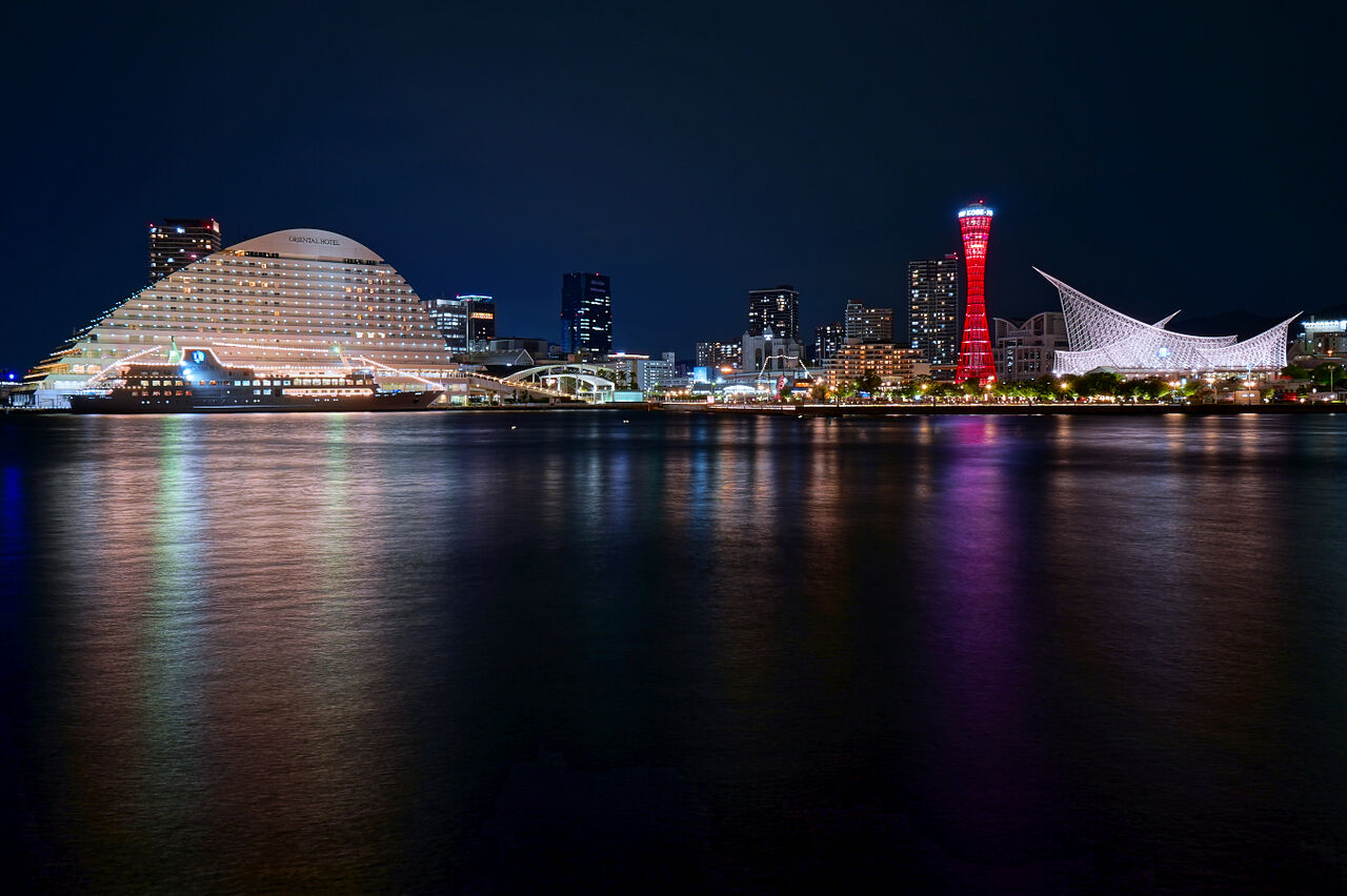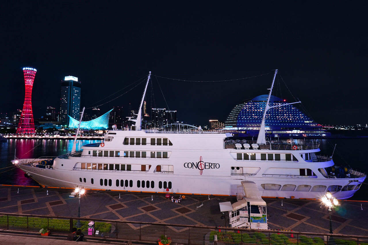 「神戸ハーバーランド」の3階から、停泊中の客船も入れて撮ってみました。平日の22時過ぎですが、人も少なく快適な撮影環境でした。