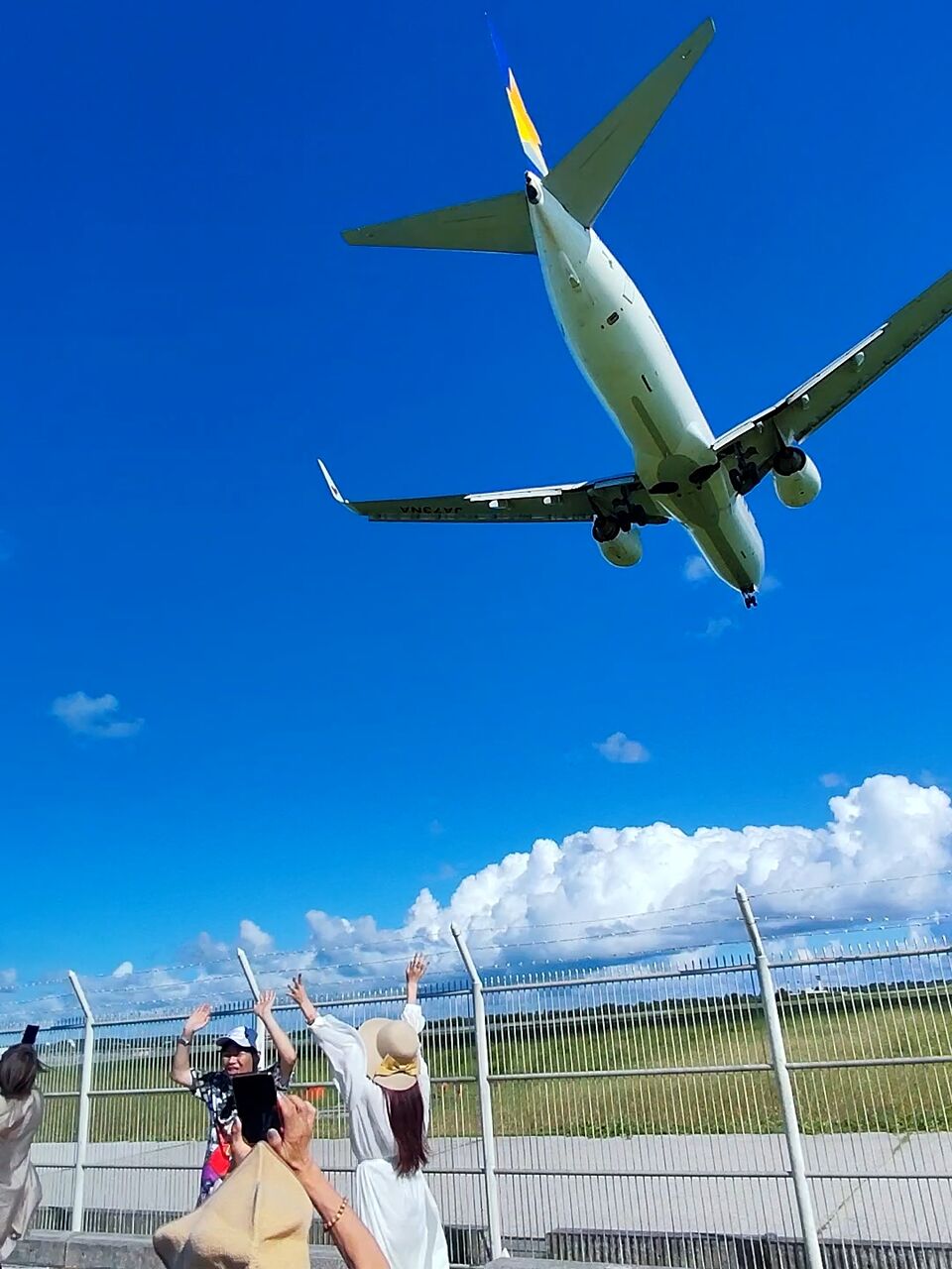まずは、14時5分着の羽田からのスカイマーク機。13時58分に到着してしまい、その時はやや遠くにいたため走って着陸コースの真下に行こうとしたが間に合わず、遠くからの撮影になってしまった。