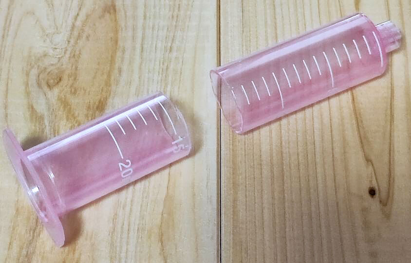 あまり小さくても扱いにくいので、10ml強まで計量できるくらいで切断↓