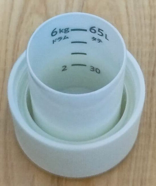 現在使用している洗濯機は、最小水量として24リットルが設定でき、少量の洗濯にはこれで十分なことが多いが、キャップに計量線が無いので、これまでは30リットル線から数mm下まで入れて使用していた。いわば目分量になってしまっているので、なんとなく気分がスッキリしないで使っていた次第。