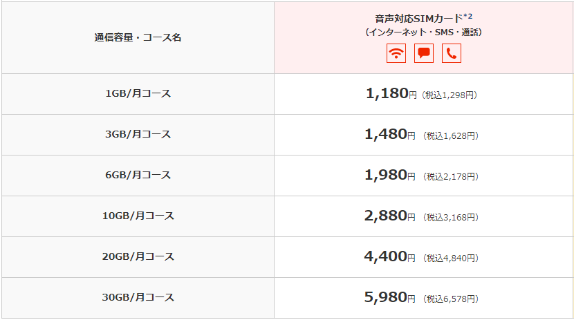 比較的安価で、データ容量にもバリエーションがあるので、あまり使わないことがわかっている月はデータ容量の低いコースに変更してコストを抑えることができます。