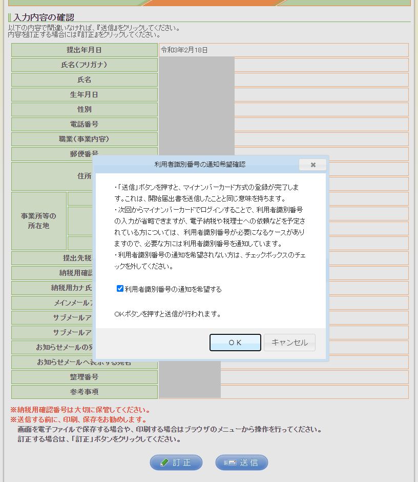 要求に従い入力し、入力内容の確認を経て送信ボタンを押すと、マイナンバーカード方式の登録が完了します。