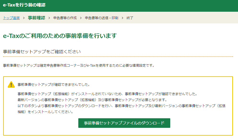 なんだか嫌な予感がしますが、メッセージに従って進んで行けば良いかと思い、「事前セットアップファイルのダウンロード」をクリックします。