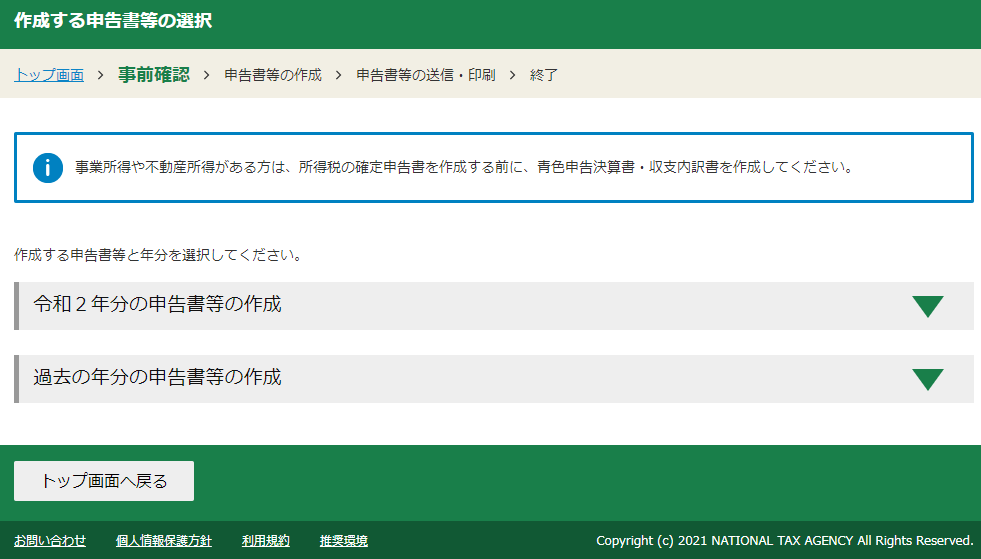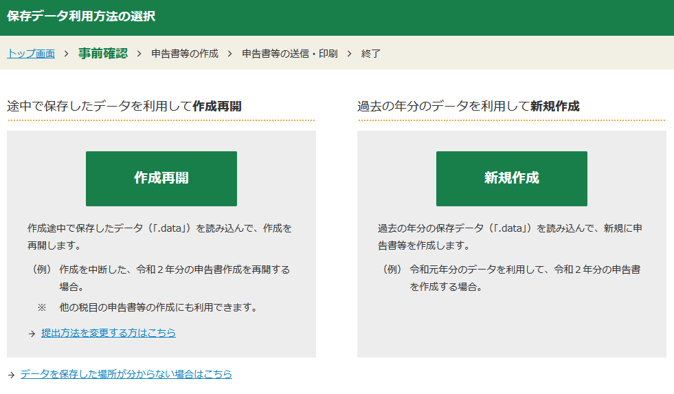 作成コーナートップから、申告書の作成方法を選択するところから始まります。