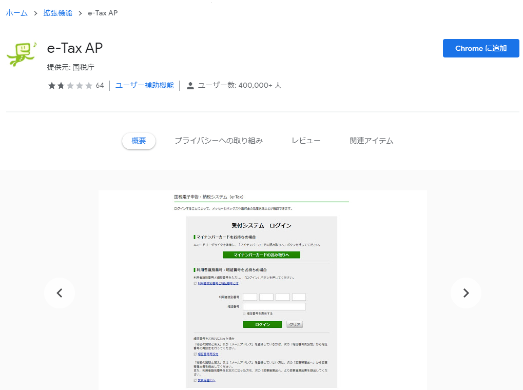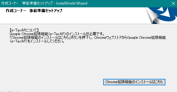 今度は、Google Chrome拡張機能(e-TaxAP)のインストールが必要とのメッセージが出現しました。